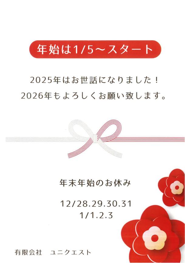 誠に勝手ながら、下記の期間を年末年始の休業とさせていただきます。